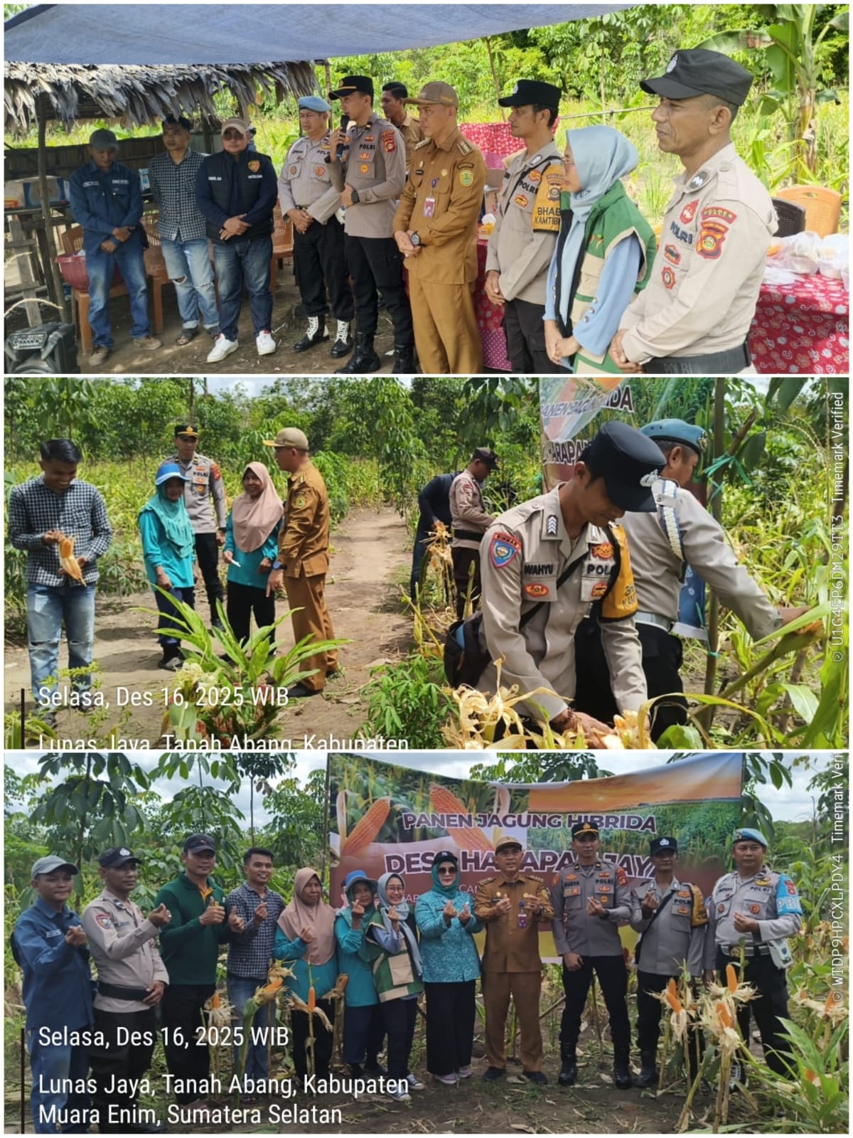 PALI,Sumselgo — Dalam rangka mendukung dan menyukseskan Program Ketahanan Pangan Nasional, jajaran Polsek Tanah Abang bersama unsur pemerintah kecamatan dan desa melaksanakan kegiatan panen jagung hibrida di Desa Harapan Jaya, Kecamatan Tanah Abang, Kabupaten Penukal Abab Lematang Ilir (PALI), Selasa (16/12/2025).