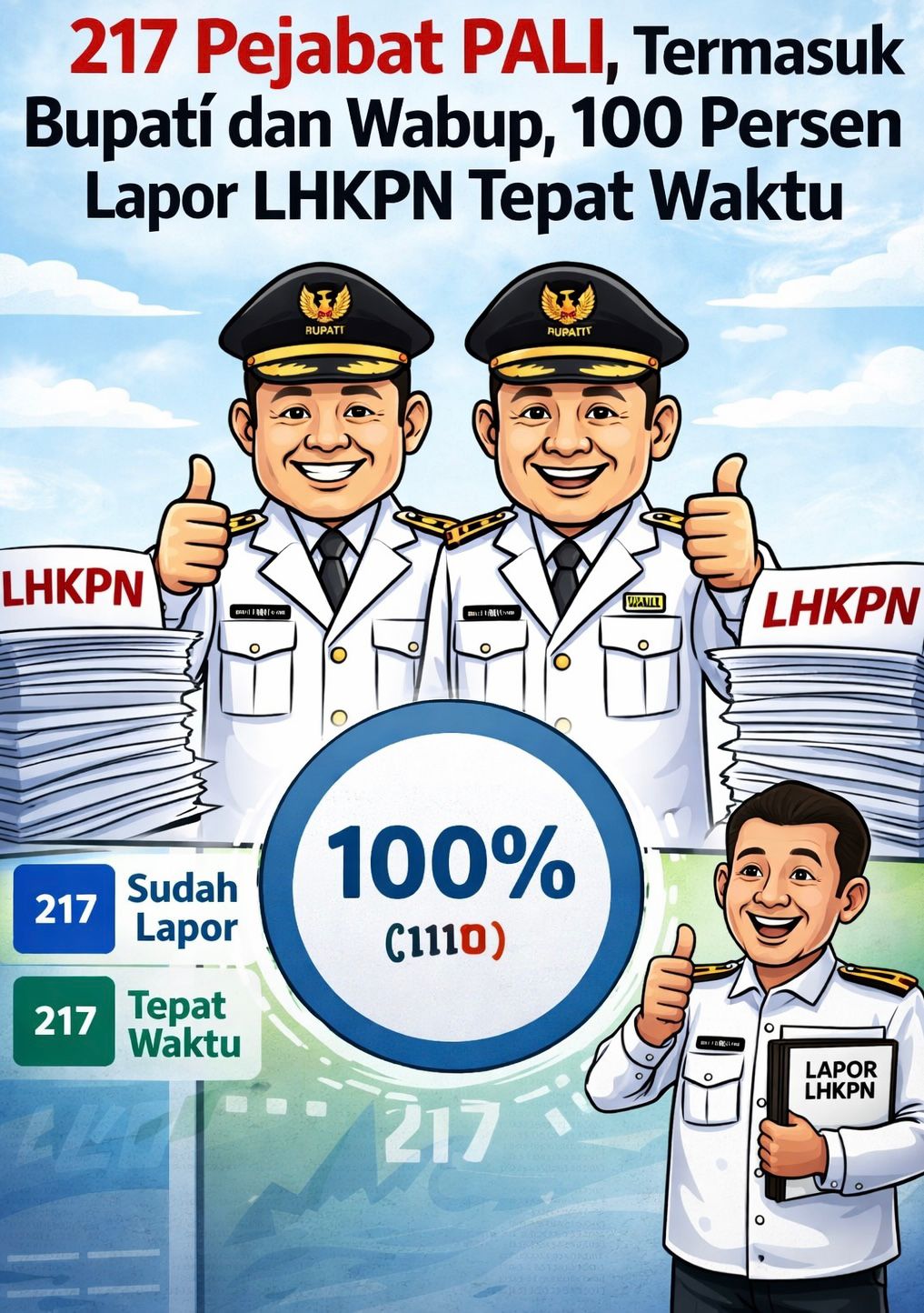 PALI,Sumselgo – Keraguan publik terkait pelaporan Laporan Harta Kekayaan Penyelenggara Negara (LHKPN) di lingkungan Pemerintah Kabupaten PALI akhirnya terjawab dengan data resmi. Sebanyak 217 pejabat, termasuk Bupati PALI Asgianto, ST dan Wakil Bupati Iwan Tuaji, SH, tercatat telah melaporkan LHKPN dengan tingkat kepatuhan 100 persen.