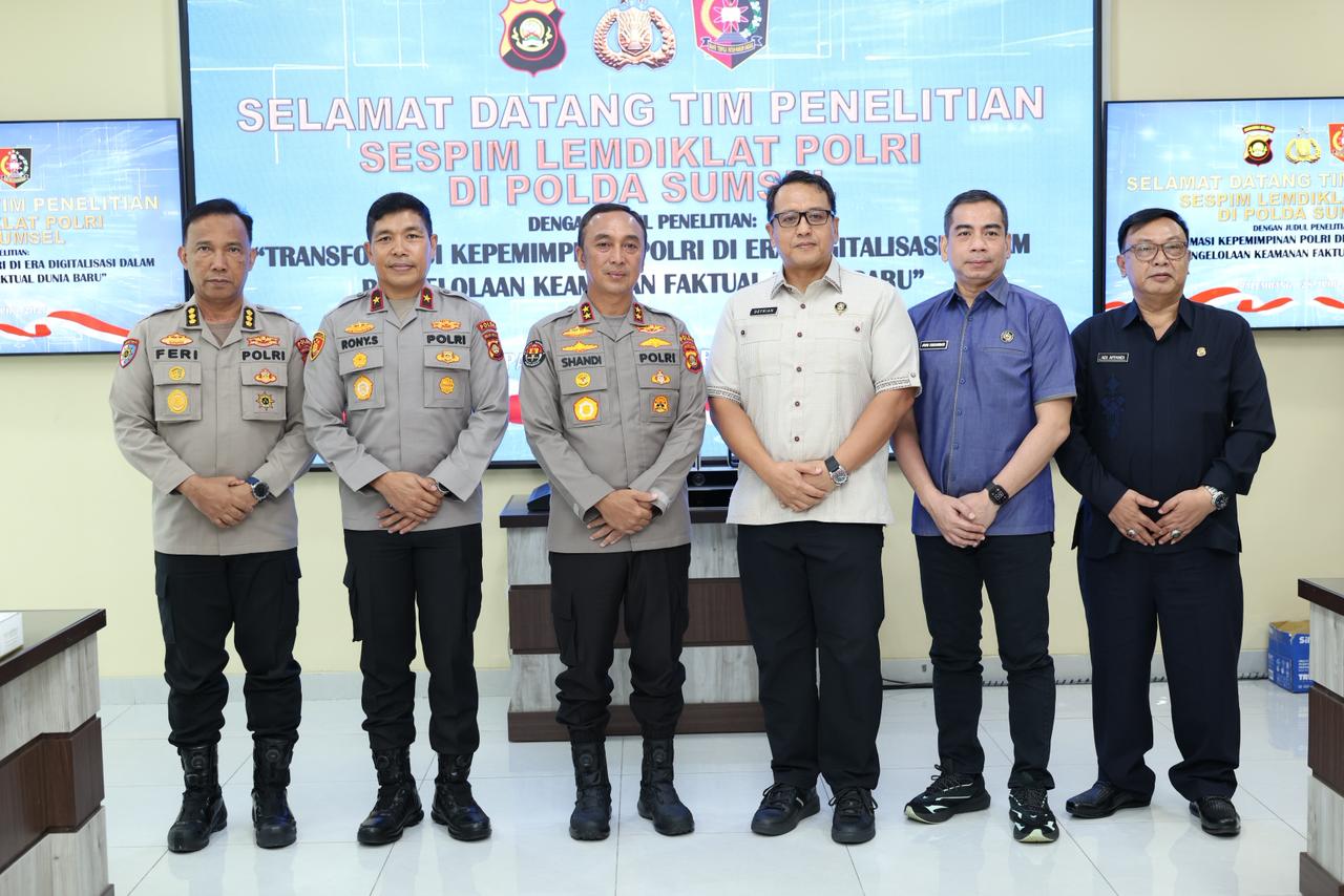 Kapolda Sumsel, Irjen Pol Sandi Nugroho, secara langsung menerima kunjungan Tim Penelitian Sespim Lemdiklat Polri di Gedung Presisi Mapolda Sumsel, Selasa, 28 April 2026. Kegiatan ini menjadi bagian dari upaya pemetaan transformasi kepemimpinan Polri dalam menghadapi dinamika keamanan di era digital.