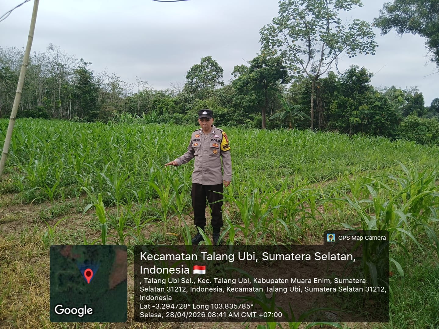 PALI,Sumselgo — Kapolsek Talang Ubi, AKP Ardiansyah, SH., diwakili Personel Bhabinkamtibmas Polsek Talang Ubi, AIPTU Affandi Bay dan BRIGPOL Arif Wahyudi, melakukan pengecekan langsung terhadap lahan pertanian jagung milik seorang petani binaan, Bapak Deni, di wilayah Beracung, Kelurahan Talang Ubi Selatan, Kecamatan Talang Ubi, Kabupaten Penukal Abab Lematang Ilir (PALI), Selasa (28/04/2026).